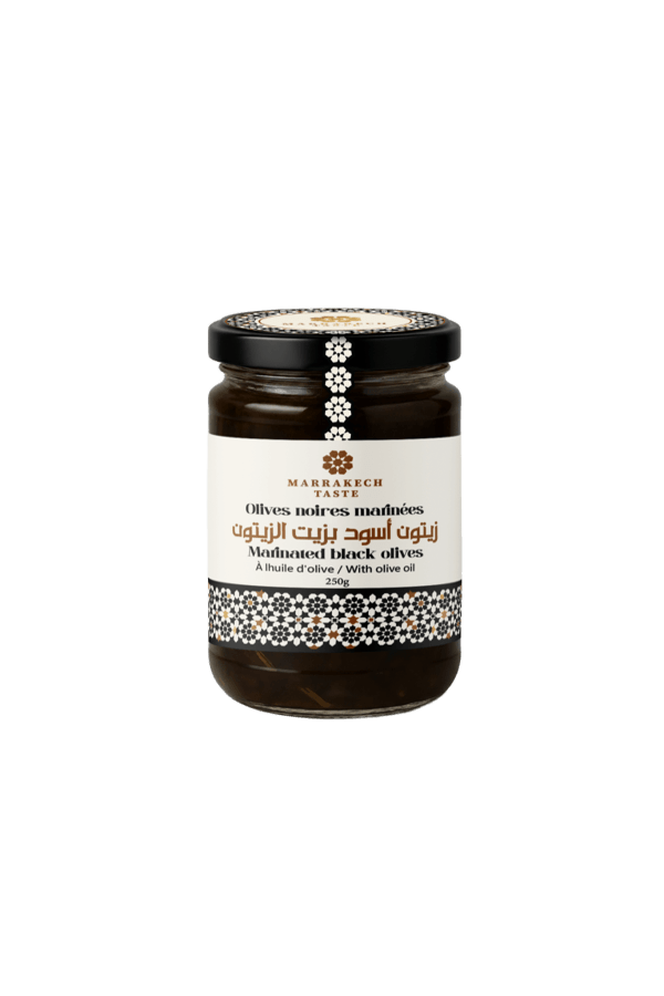 These Moroccan black olives are marinated to produce a mild flavour that pairs beautifully with mint tea, bread and soft goat’s cheese. Marinated olives are a staple of Moroccan kitchens; they are served as a side dish and used to decorate tagines and salads, often combined with preserved lemon or harissa.
